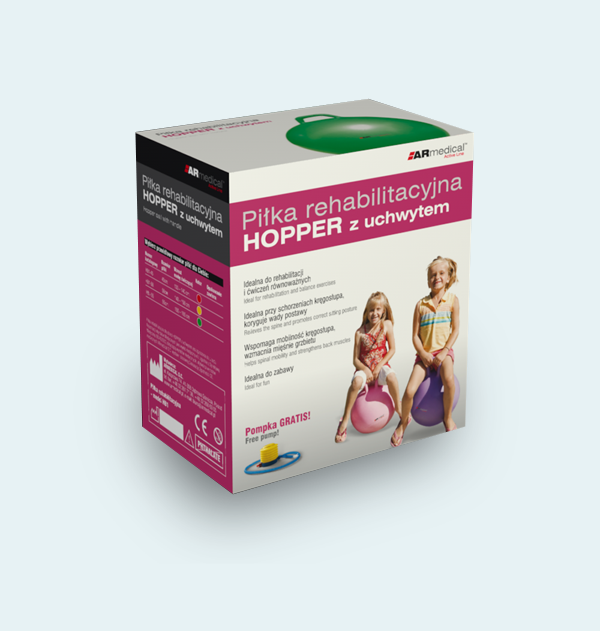 Piłka rehabilitacyjna dla dzieci HOPPER z uchwytem przeznaczona jest do korygowania wad postawy u dzieci, w terapii mającej na celu poprawę kondycji i koordynacji ruchowej, wzmocnienia mięśni grzbietu, zwiększenia ruchomości stawów oraz w schorzeniach neurologicznych. Doskonała dla osób chcących zachować sprawność fizyczną dzięki treningowi ogólnorozwojowemu.Doskonała również do zabawy zapewniającej korekcje wad postawy u dzieci.