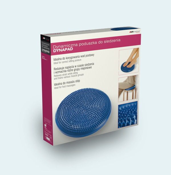 Dynamiczna poduszka DYNAPAD przeznaczona jest do korygowania wad postawy oraz wzmocnienia mięśni grzbietu. Odciąża odcinek lędźwiowy kręgosłupa podczas siedzenia i wymusza siedzenie w prawidłowej pozycji, stymuluje mikro-ruchy krążków międzykręgowych. Szczególnie polecana dla osób, które dużo siedzą. Dzięki wyposażeniu w zaworek do regulacji ciśnienia, istnieje możliwość dopasowania właściwej twardośći poduszki. Poduszka posiada dwufunkcyjne zastosowanie, dzięki wypustkom (kolcom na jednej z powierzchni) znajduje również zastosowanie w masażu stóp, poprawiając ich ukrwienie oraz stymulując receptory.